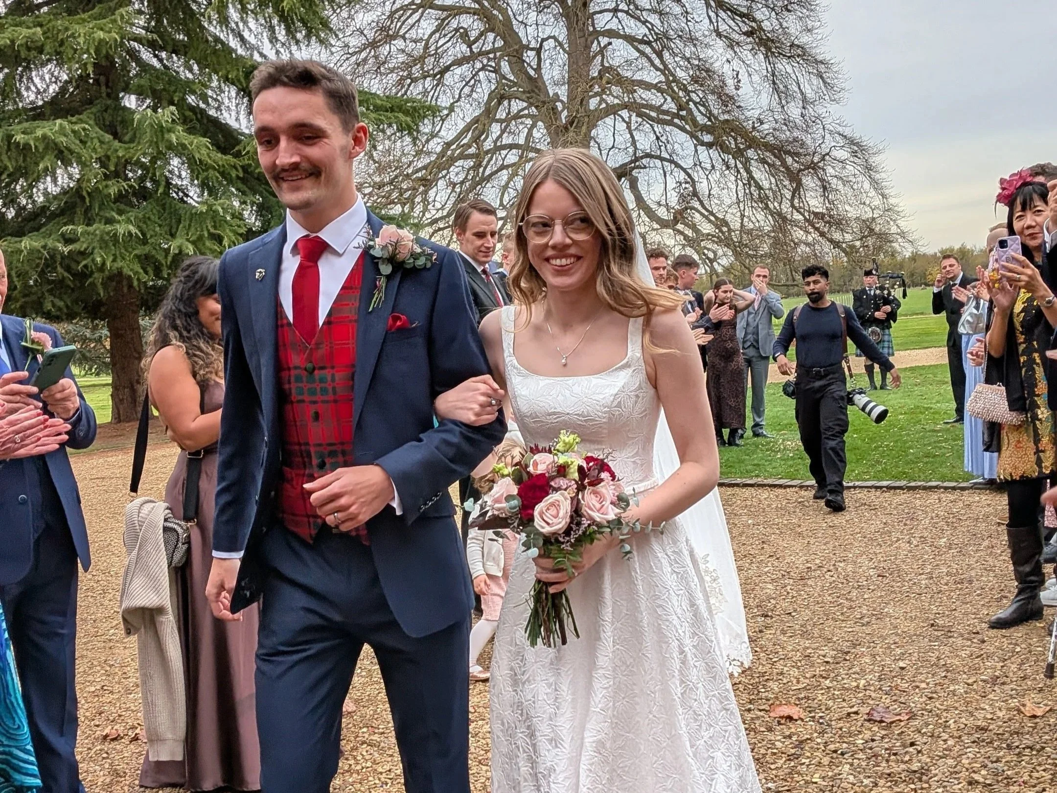 For reference, the groomsmen will be in navy blue suits, and the bridesmaids will be in lilac dresses and the colour scheme is navy blue, lilac and burgundy.